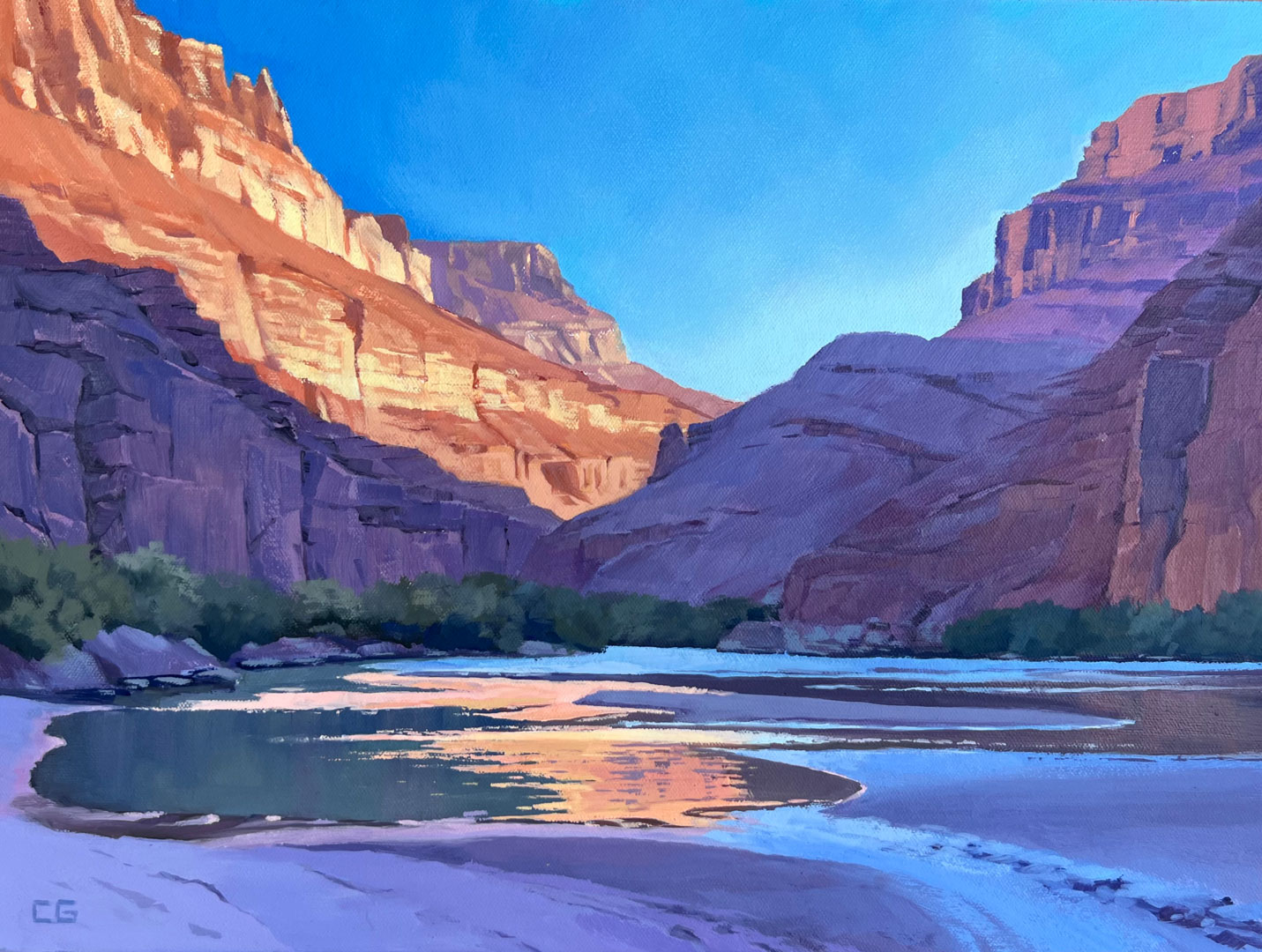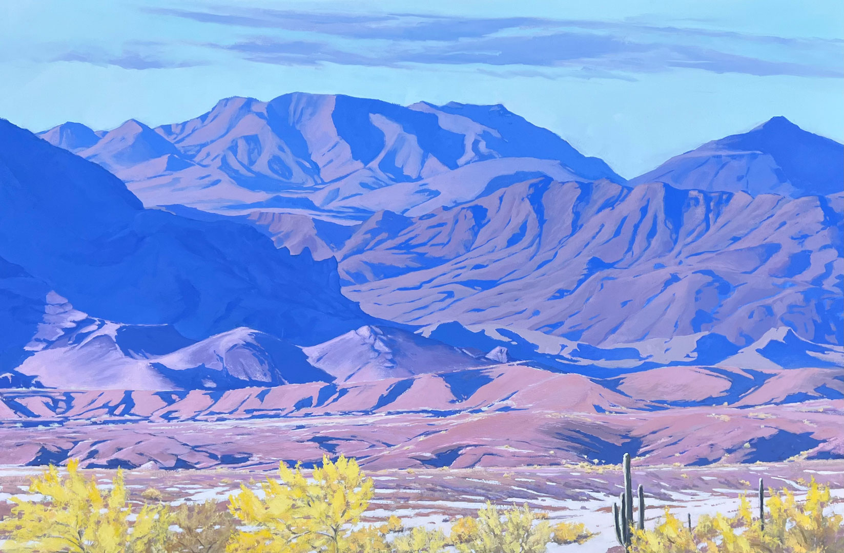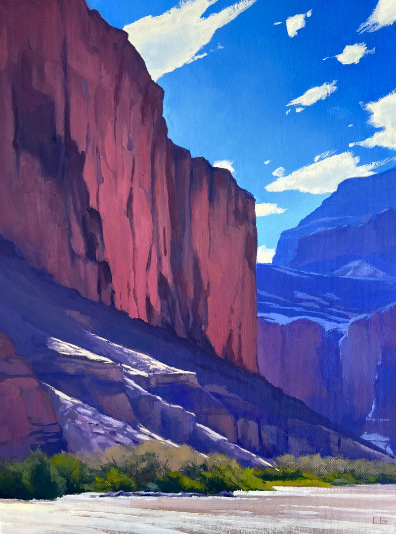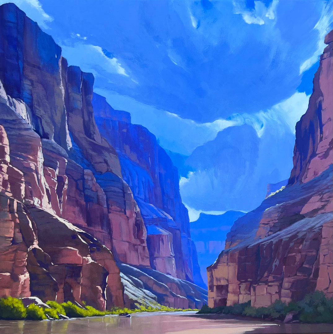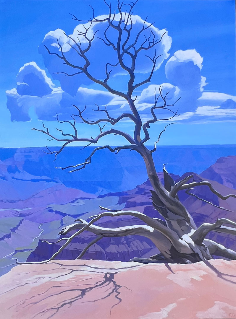 The unique and incomparable landscape of the Southwest has been Corey’s muse for as long as she cam remember. Growing up in Arizona she spent countless hours exploring its deserts, canyons and forests, and these places with their every changing light and color remain her favorite things to paint. Having been a professional gemstone appraiser for many years, Corey has an affinity for the spectacular colors of the Western landscape. They are pure, clear and crystalline and like gemstones they change along with the light. Corey’s paintings celebrate these everchanging moments and capture them on canvas for the viewer. Almost all of Corey’s paintings begin outdoors with the completion of an onsite study in which she records her direct impressions that are then used to create her larger paintings. Corey’s ultimate goal is to provide the viewer a visual journey to those places, where they can sense the sun on their skin, the breeze in their hair, the smell of creosote and the feeling of rocks and sand under their feet. Corey never tires of the Western landscape, the haunting petroglyphs, the shadows racing across the mountains and the clouds dancing in the sky. She lives in beautiful Wickenburg, Arizona with her soulmate, her pack of dogs and the many desert creatures she calls her wild pets.